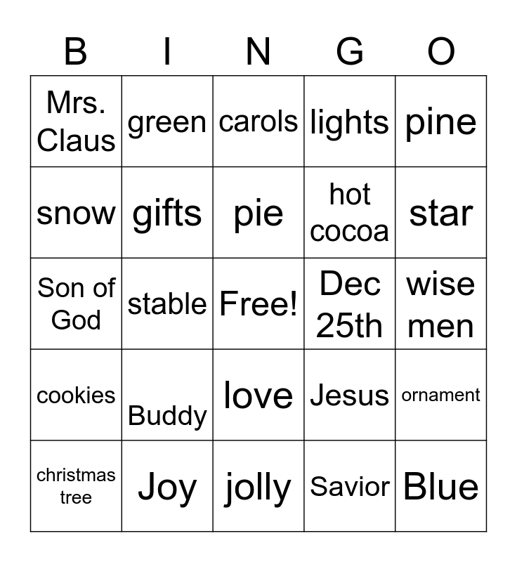 This bingo card has a free space and 24 words: Buddy, Joy, pie, christmas tree, pine, Mrs. Claus, snow, green, Dec 25th, love, hot cocoa, Son of God, Jesus, ornament, gifts, Savior, wise men, carols, star, stable, Blue, cookies, lights and jolly.