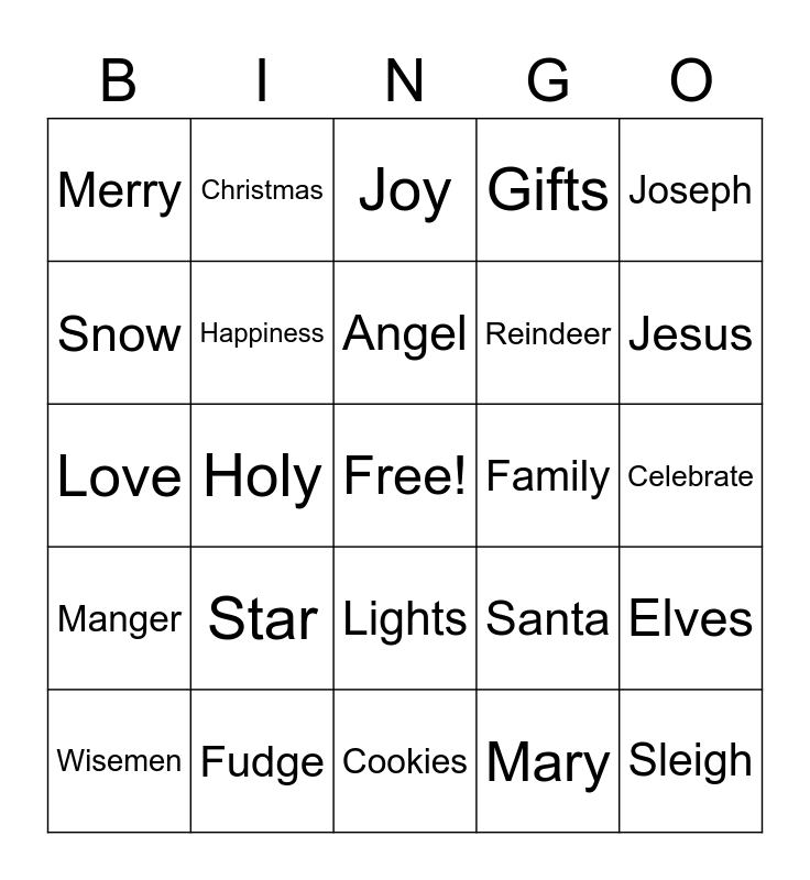 This bingo card has a free space and 24 words: Wisemen, Star, Angel, Mary, Joseph, Merry, Christmas, Joy, Family, Celebrate, Love, Happiness, Santa, Elves, Snow, Fudge, Cookies, Gifts, Jesus, Manger, Holy, Lights, Reindeer and Sleigh.