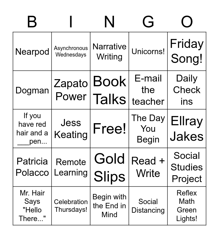 This bingo card has a free space and 29 words: Mr. Hair Says "Hello There...", Wash Your Hands, Jess Keating, Some Birthday!, Nearpod, Narrative Writing, Zapato Power, Remote Learning, The Day You Begin, Celebration Thursdays!, Ellray Jakes, Reflex Math Green Lights!, Begin with the End in Mind, Social Distancing, Daily Check ins, There's a ____ in Me, Gold Slips, Patricia Polacco, Friday Song!, If you have red hair and a ___pen..., Read + Write, Book Box Upgrades, E-mail the teacher, Dogman, Unicorns!, Asynchronous Wednesdays, Social Studies Project, Book Talks and Food Drive Winners!.