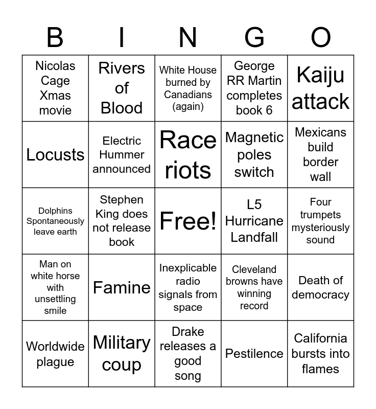 This bingo card has a free space and 24 words: Famine, Military coup, Race riots, Worldwide plague, Kaiju attack, Nicolas Cage Xmas movie, Locusts, Rivers of Blood, L5 Hurricane Landfall, Inexplicable radio signals from space, Magnetic poles switch, Dolphins Spontaneously leave earth, Cleveland browns have winning record, Death of democracy, Electric Hummer announced, Pestilence, Four trumpets mysteriously sound, White House burned by Canadians (again), Mexicans build border wall, Stephen King does not release book, California bursts into flames, Man on white horse with unsettling smile, George RR Martin completes book 6 and Drake releases a good song.