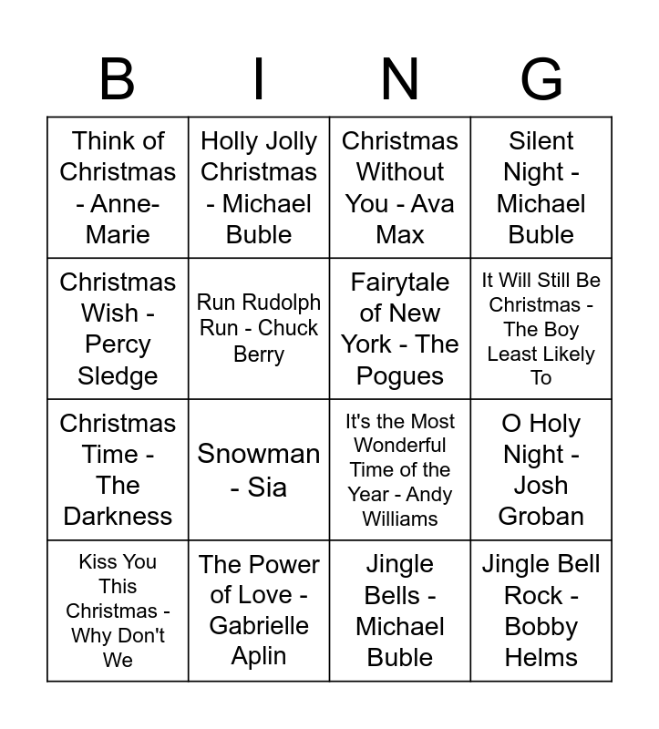 This bingo card has 94 words: 2000 Miles - Pretenders, A Spaceman Came Travelling - Chris de Burgh, A Winter's Tale - David Essex, All I Want for Christmas Is You - Mariah Carey, All You're Dreaming Of - Liam Gallagher, At Christmas - Kylie Minogue, Baby, It's Cold Outside - Brett Eldredge, Back Door Santa - Clarence Carter, Blame It On The Mistletoe - Ella Henderson, Blue Christmas - Michael Buble, Christmas Always Finds Me - Ingrid Andress, Christmas Eve - Kelly Clarkson, Christmas Lights - Coldplay, Christmas Time - The Darkness, Christmas Time Is Here - Brett Eldredge, Christmas Wish - Percy Sledge, Christmas Without You - Ava Max, Christmas Wrapping - The Waitresses, Cold December Night - Michael Buble, Cold In December - Josie Dunne, Count on Christmas - Bebe Rexha, Cuddle Up, Cozy Down Christmas - Dolly Parton, Deck The Hall - Nat King Cole, Do They Know It's Christmas? - Band Aid, Driving Home for Christmas - Chris Rea, Fairytale of New York - The Pogues, Finally It's Christmas - Hanson, Frosty the Snowman - The Ronettes, Gee Whiz, It's Christmas - Carla Thomas, Happy Xmas - John Lennon, Hard Candy Christmas - Cyndi Lauper, Have Yourself a Merry Little Christmas - Michael Buble, HERE - Lukas Graham, Here Comes Santa Claus - Gene Autry, Holly Jolly Christmas - Michael Buble, I Believe in Father Christmas - Emerson, Lake & Palmer, I Wish It Could Be Christmas Everyday - Wizzard, I'll Be Home for Christmas - Michael Buble, It Will Still Be Christmas - The Boy Least Likely To, It's Beginning to Look a Lot like Christmas - Michael Buble, It's the Most Wonderful Time of the Year - Andy Williams, Jingle Bell Rock - Bobby Helms, Jingle Bells - Michael Buble, Just Like Christmas - Low, Kiss You This Christmas - Why Don't We, Last Christmas - Remastered - Wham!, Let It Snow! Let It Snow! Let It Snow! - Dean Martin, Little Drummer Boy - Kenny Rogers, Little Saint Nick - The Beach Boys, Lonely This Christmas - Mud, Love Is A Compass - Griff, Love this Christmas - Rick Astley, Mary's Boy Child - Matt Monro, Merry Christmas Baby - Otis Redding, Merry Christmas Darling - Christina Perri, Merry Christmas Everyone - Shakin' Stevens, Merry Xmas Everybody - Slade, Mistletoe and Wine - Cliff Richard, Must Be Santa - Alma Cogan, Never Do a Tango with an Eskimo - Alma Cogan, O Holy Night - Josh Groban, Oh Santa - Kylie Minogue, One More Sleep - Leona Lewis, Please Come Home for Christmas - Eagles, Presents for Christmas - Solomon Burke, River - Idina Menzel, Rockin' Around the Christmas Tree - Brenda Lee, Rudolph the Red-Nosed Reindeer - Gene Autry, Run Rudolph Run - Chuck Berry, Santa Baby - Kylie Minogue, Santa Claus Is Coming To Town - The Jackson 5, Santa Tell Me - Ariana Grande, Santa's Coming for Us - Sia, Saviour's Day - Cliff Richard, Silent Night - Michael Buble, Silver Bells - Michael Buble, Sleigh Ride - The Ronettes, Snowman - Sia, Somewhere Only We Know - Lily Allen, Step into Christmas - Elton John, Stop the Cavalry - Jona Lewie, Thank God It's Christmas - Queen, The Christmas Song - Nat King Cole, The Power of Love - Gabrielle Aplin, Think of Christmas - Anne-Marie, This Christmas - Donny Hathaway, Under The Mistletoe - Kelly Clarkson, Walking In The Snow - Brynn Elliott, Warm on a Christmas Night - HONNE, What Christmas Means to Me - CeeLo Green, When a Child Is Born - Johnny Mathis, White Christmas - The Drifters, Winter Wonderland - Blake Shelton and Wonderful Christmastime - Paul McCartney.