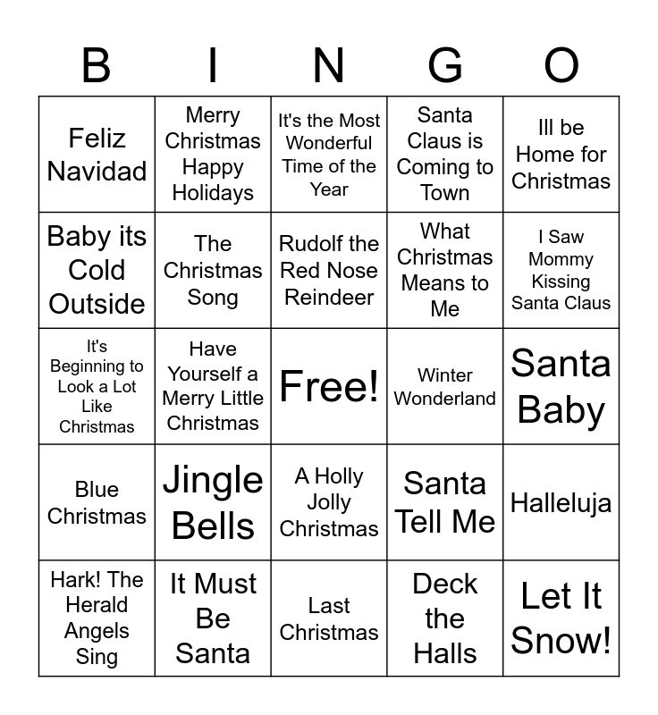 This bingo card has a free space and 37 words: White Christmas, Frosty the Snowman, O Holy Night, The Christmas Song, Halleluja, Jingle Bells, Rudolf the Red Nose Reindeer, Christmas Cannon, Ill be Home for Christmas, Little Drummer Boy, Have Yourself a Merry Little Christmas, Santa Claus is Coming to Town, Let It Snow!, Santa Baby, Baby its Cold Outside, Blue Christmas, Rockin' Around the Christmas Tree, It's the Most Wonderful Time of the Year, A Holly Jolly Christmas, Winter Wonderland, Feliz Navidad, I Saw Mommy Kissing Santa Claus, Hark! The Herald Angels Sing, Last Christmas, All I want a for Christmas is You, Deck the Halls, Merry Christmas Happy Holidays, 12 days of Christmas, Joy to the World, Silent Night, O Come, All Ye Faithful, It Must Be Santa, It's Beginning to Look a Lot Like Christmas, Mistletoe, Santa Tell Me, What Christmas Means to Me and Do You Hear What I Hear.