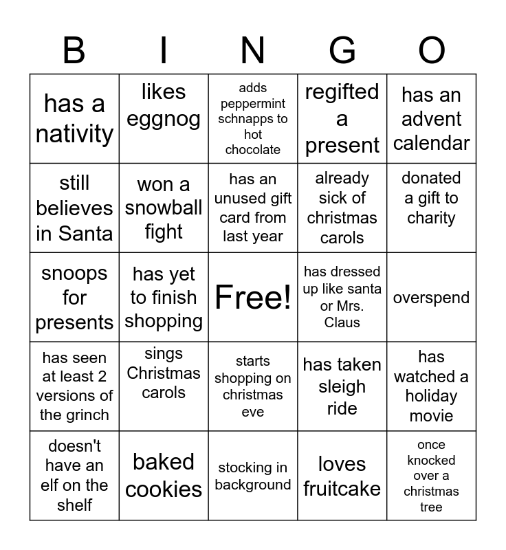 This bingo card has a free space and 24 words: sings Christmas carols, baked cookies, has an unused gift card from last year, doesn't have an elf on the shelf, has an advent calendar, has a nativity, still believes in Santa, likes eggnog, has dressed up like santa or Mrs. Claus, starts shopping on christmas eve, already sick of christmas carols, snoops for presents, has taken sleigh ride, has watched a holiday movie, won a snowball fight, loves fruitcake, overspend, adds peppermint schnapps to hot chocolate, donated a gift to charity, has yet to finish shopping, once knocked over a christmas tree, has seen at least 2 versions of the grinch, regifted a present and stocking in background.