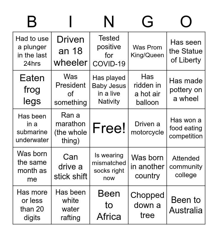 This bingo card has a free space and 50 words: Rode a horse, Been to Australia, Been to Asia, Been to Europe, Been to Africa, Can drive a stick shift, Jumped out of an airplane, Driven an 18 wheeler, Broken a bone, Eaten frog legs, Has a tattoo, Was President of something, Was Prom King/Queen, Attended community college, Was born in another country, Thinks they are cool, Has more than 5 siblings, Has played Baby Jesus in a live Nativity, Driven a motorcycle, Has ridden on the subway, Has seen the Statue of Liberty, Ran a marathon (the whole thing), Chopped down a tree, Had to use a plunger in the last 24hrs, Has ridden in a hot air balloon, Has been arrested, Has had over 10 cats at one time, Has made pottery on a wheel, Finished a novel in 1 day, Tested positive for COVID-19, Is wearing mismatched socks right now, Is wearing Xmas themed undergarments right now, Had their picture in the paper, Has visited over 25 states, Has been bungee jumping, Has been white water rafting, Has seen the Grand Canyon, Has been shot before, Has a false tooth, Thinks this Bingo game sucks, Has won a food eating competition, Swam with dolphins, Has never been to Disney World, Has a piercing that is not visible, Missing an organ, Has more or less than 20 digits, Has been in a submarine underwater, Thinks cilantro tastes like soap, Has seen Mt. Rushmore, Was born the same month as me and Is left-handed and Can speak another language fluently.