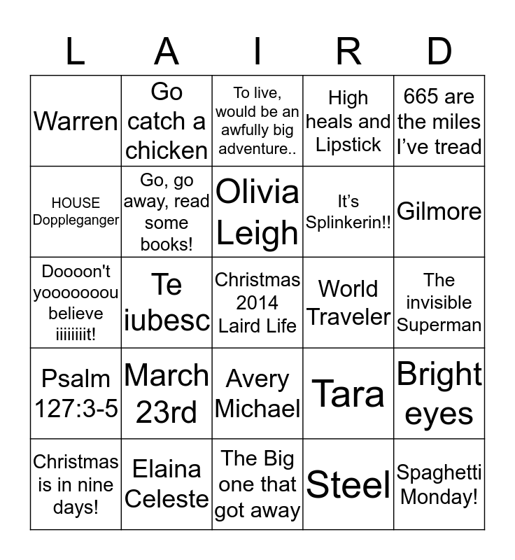 This bingo card has a free space and 34 words: Biscuits and Gravy!, Steel, Sophia Rose, Price, Psalm 127:3-5, Go, go away, read some books!, 665 are the miles I’ve tread, Christmas is in nine days!, Go catch a chicken, It's a wonderful Life, Olivia Leigh, To live, would be an awfully big adventure.., January 21st, Spaghetti Monday!, World Traveler, Gilmore, Elaina Celeste, Doooon't yooooooou believe iiiiiiiit!, March 23rd, Tara, Avery Michael, Under a bridge, Warren, The invisible Superman, The Big one that got away, Spaghetti Monday!, High heals and Lipstick, HOT BREAD! Mommy’s cookin!, It’s Splinkerin!!, HOUSE Doppleganger, Biscuits and Gravy!, Te iubesc, Bright eyes and Romania.