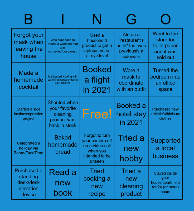 This bingo card has a free space and 51 words: Changed from "daytime pajamas" to nighttime pajamas, Stayed inside your house/apartment for 24 (or more) hours, Had an Amazon package arrive and couldn't remember what you ordered, Tried cooking a new recipe, Baked homemade bread, Was supposed to be the bride/groom in a wedding that was cancelled/postponed, Was supposed to attend a wedding that was cancelled/postponed, Was supposed to be a bridesmaid/groomsman in a wedding that was cancellled/postponed, Made a homemade cocktail, Tried a new workout regimen, Multitasked working with watching/homeschooling your children, Ate on a "restaurant's patio" that was previously a sidewalk, Supported a local business, Tried a new hobby, Did something artistic/crafty, Binge watched an entire series on a streaming service, Booked a flight in 2021, Booked a hotel stay in 2021, Bought more than one pack of toilet paper at once, Went to the store for toilet paper and it was sold out, Shouted when your favorite cleaning product was back in stock, Tried a new cleaning product, Forgot your mask when leaving the house, Wore a mask to coordinate with an outfit, Sewed a mask for yourself, family, or friends, Thanked a healthcare worker for their efforts, Turned the bedroom into an office space, Purchased a ring light, Purchased a standing desk/desk elevation device, Used a household product to get a laptop/camera at eye level, Completed a wine advent calendar, Had a socially distanced happy hour/gathering with friends/family, Attended a backyard wedding/event, Sat in a park/outdoor space you've never been to before, Thought you had COVID, but really just needed water/sleep, Read a new book, Listened to a new podcast, Utilized curbside pickup being offered by a retail store, Purchased new sweatpants/loungewear, Bought new loungewear that is fancier than your old loungewear, Purchased new athletic/athleisure clothes, Celebrated a holiday via Zoom/FaceTime, Held or attended a virtual meeting that is normally in person, Cleaned out/organized a space in your house, Did a puzzle, Cut your own hair, Started a side business/passion project, Said "You're on mute!!!" to a fellow Zoomer, Forgot to take yourself off mute, Forgot to turn your camera off on a video call when you intended to be unseen and Held up your dog/cat during a zoom call.