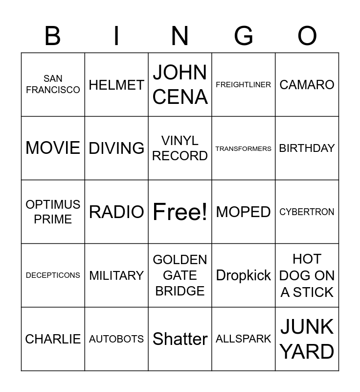 This bingo card has a free space and 29 words: BUMBLEBEE, AUTOBOTS, JOHN CENA, MEMO, CAMARO, SAN FRANCISCO, DIVING, VINYL RECORD, MOPED, HOT DOG ON A STICK, CHARLIE, RADIO, ALLSPARK, JUNK YARD, OPTIMUS PRIME, CORVETTE, Shatter, Dropkick, BIRTHDAY, DECEPTICONS, MILITARY, VW, TRANSFORMERS, CYBERTRON, MOVIE, HELMET, GOLDEN GATE BRIDGE, FREIGHTLINER and OTIS.