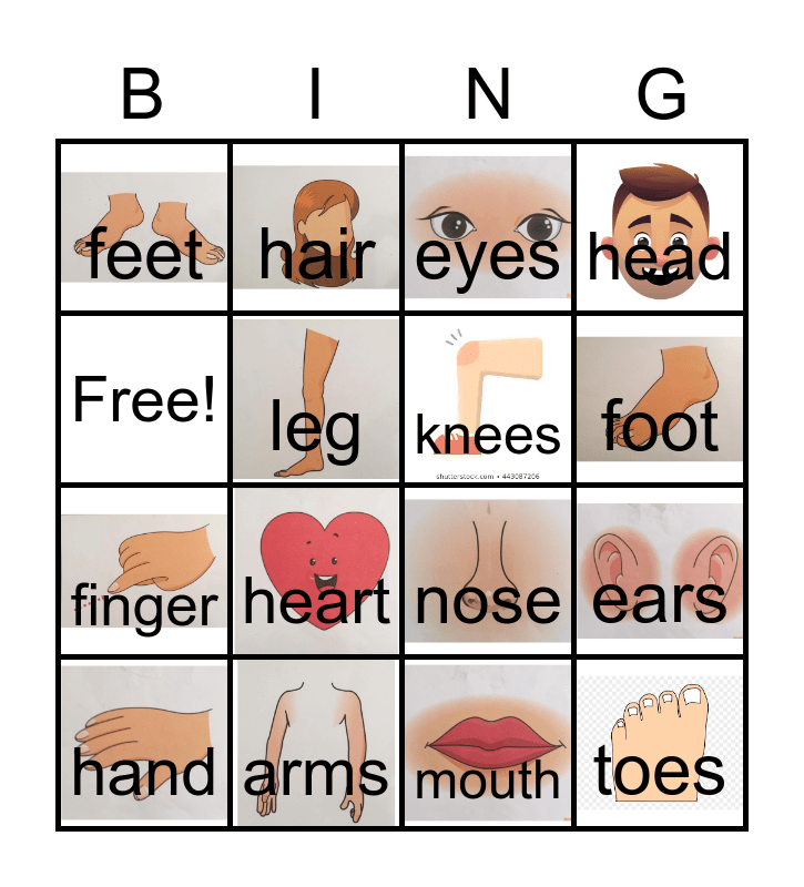 This bingo card has 15 images and 16 words: arms, ears, eyes, feet, finger, hair, nose, mouth, Free!, leg, hand, head, heart, foot, knees and toes.