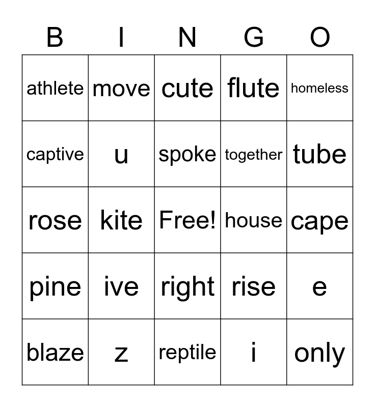 This bingo card has a free space and 24 words: ive, z, spoke, blaze, homeless, athlete, captive, move, house, right, together, rose, rise, e, u, i, cape, cute, tube, kite, only, pine, flute and reptile.