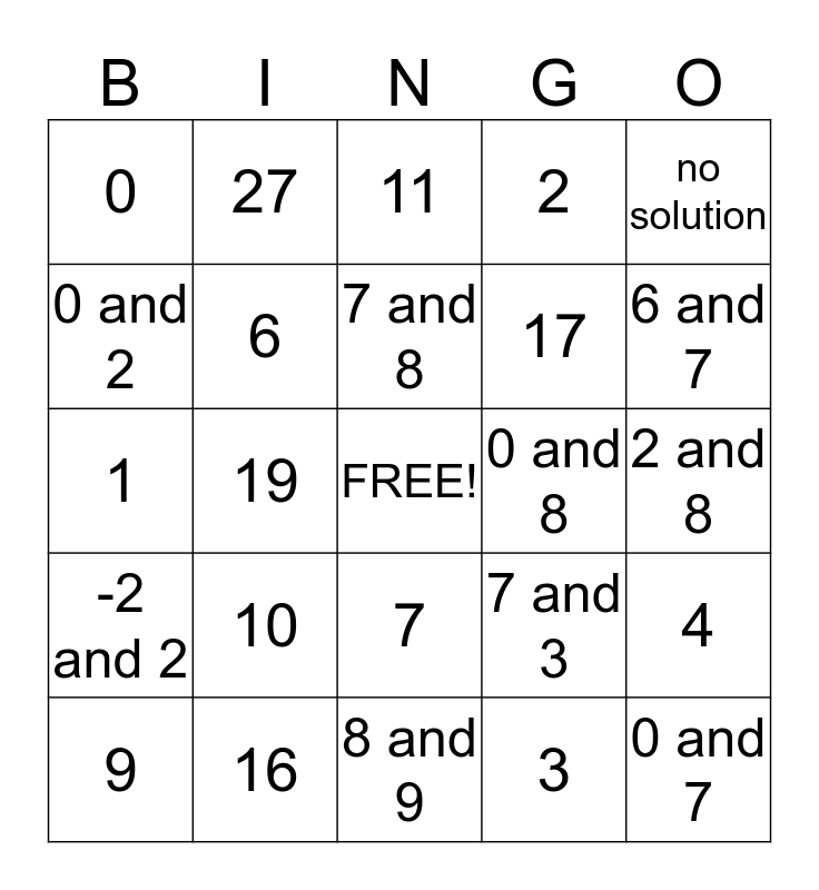 This bingo card has a free space and 24 words: 10, 16, 7 and 8, 9, no solution, 0, 0 and 2, 27, 0 and 8, 7, 17, 1, 7 and 3, 4, 6, 3, 2 and 8, 11, 6 and 7, 19, 0 and 7, -2 and 2, 2 and 8 and 9.