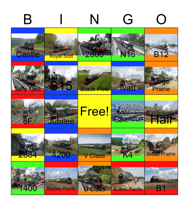 This bingo card has 24 images, a free space and 24 words: 4200, Gresley Pacific, Black Five, 1400, B12, Castle, Taffy Tank, Royal Scot, Coronation, V Class, Ivatt, 8F, K4, Small Prairie, S15, Bulleid Pacific, Hall, 2800, Large Prairie, Jubilee, B1, 2884, N15 and U Class.