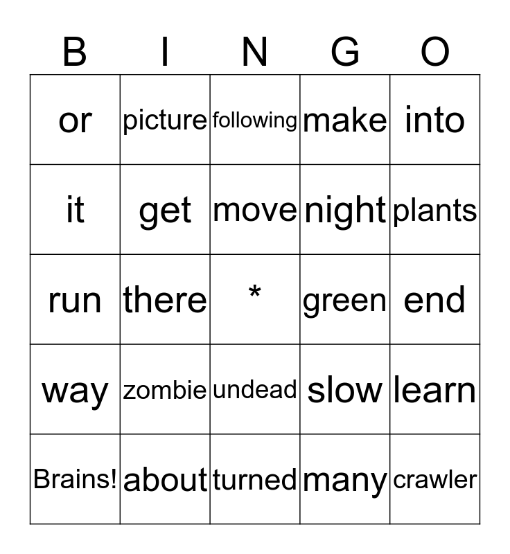 This bingo card has a free space and 24 words: zombie, about, move, Brains!, into, or, it, picture, green, undead, night, run, slow, learn, get, many, end, following, plants, there, crawler, way, make and turned.