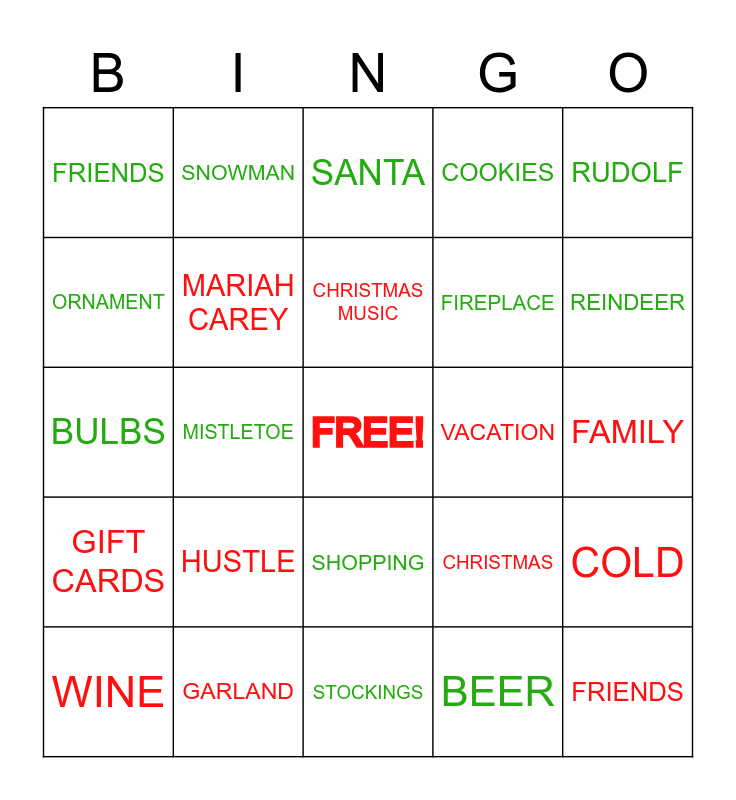 This bingo card has a free space and 34 words: LIGHTS, BEER, TREE, SNOW, GIFT CARDS, MARIAH CAREY, RUDOLF, WINE, SNOWMAN, RIBBONS, CHRISTMAS MUSIC, SANTA, SNOW BOOTS, PRESENTS, VACATION, REINDEER, GARLAND, BULBS, HUSTLE, CHRISTMAS, SHOPPING, DECORATIONS, FRIENDS, FAMILY, STOCKINGS, FRIENDS, COOKIES, ICE, FIREPLACE, ORNAMENT, LA-Z-BOY, MISTLETOE, COLD and CINNAMON.