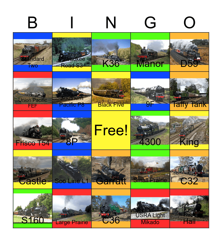 This bingo card has 24 images, a free space and 24 words: Soo Line L1, Large Prairie, Black Five, S160, D59, Standard Two, Union Pacific FEF, Milwaukee Road S3, 4300, Garratt, 9F, Frisco T54, Small Prairie, C32, Southern Pacific P8, USRA Light Mikado, King, K36, Taffy Tank, 8P, Hall, Castle, Manor and C36.
