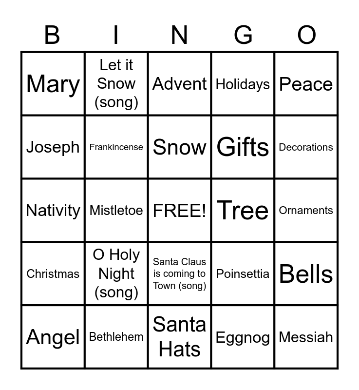 This bingo card has 1 images, a free space and 59 words: Bethlehem, Birth, Christmas, Eggnog, Family, Frankincense, Friends, Gifts, Gold, Holidays, Jesus, Joseph, Love, Manger, Mary, Messiah, Peace, Shepherd, Snow, Tree, Advent, Angel, Bells, Bethlehem, Candy Cane, Carols, Christmas Lights, Decorations, Give Love on Christmas Day (song), In Excelsis Deo (song), Jingle Bell Rock (song), Jingle Bells (song), Lanterns, Let it Snow (song), Little Drummer Boy (song), Magi, Mistletoe, Myrrh, Nativity, North Star, O Holy Night (song), Ornaments, Pine Tree, Poinsettia, Presents, Reindeer, Rudolph Red-Nosed Reindeer (song), Santa Claus, Santa Claus is coming to Town (song), Santa Hats, Shepherds, Silent Night, Sleigh, Snowball, Snowman, Stable, Star, Stocking and We Three Kings (song).