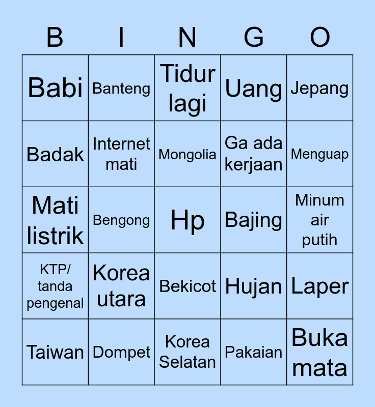 This bingo card has 25 words: Korea utara, Korea Selatan, Mongolia, Taiwan, Jepang, Babi, Badak, Banteng, Bajing, Bekicot, Ga ada kerjaan, Mati listrik, Hujan, Laper, Internet mati, Buka mata, Minum air putih, Tidur lagi, Menguap, Bengong, Hp, Dompet, KTP/ tanda pengenal, Uang and Pakaian.