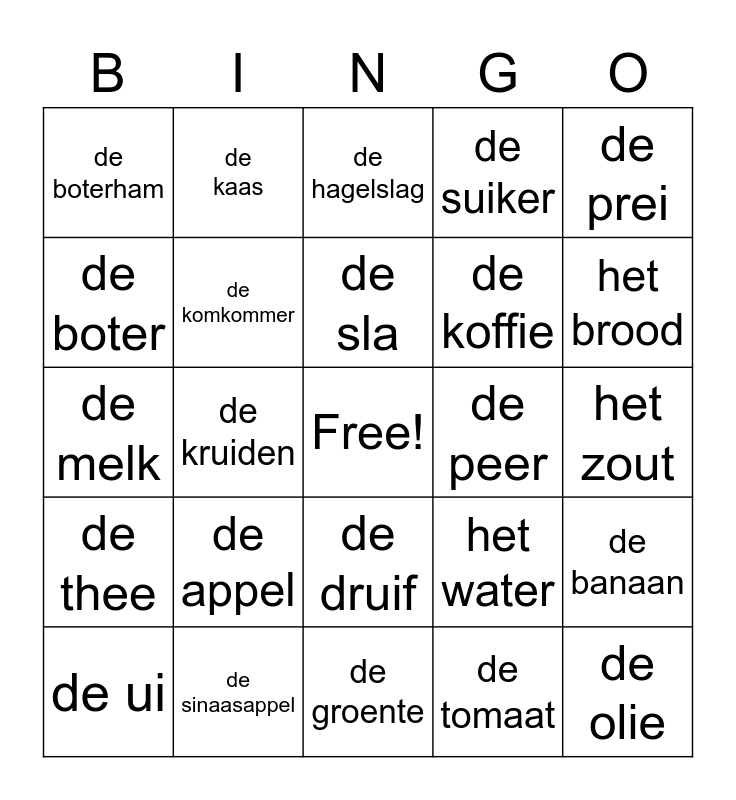 This bingo card has a free space and 24 words: de appel, de sinaasappel, de sla, de ui, de prei, de boterham, de boter, de kaas, de peer, de druif, de koffie, de melk, het water, de banaan, de komkommer, de tomaat, het zout, de hagelslag, het brood, de kruiden, de olie, de thee, de suiker and de groente.