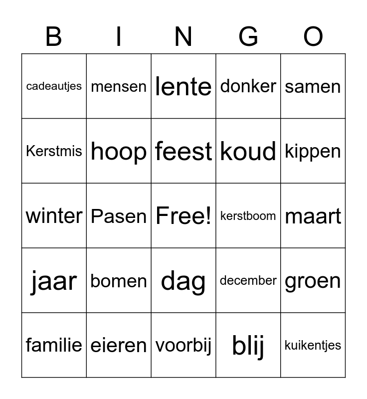 This bingo card has a free space and 24 words: bomen, eieren, feest, familie, samen, cadeautjes, Kerstmis, mensen, kerstboom, dag, koud, winter, december, groen, hoop, blij, maart, lente, kippen, Pasen, kuikentjes, jaar, donker and voorbij.