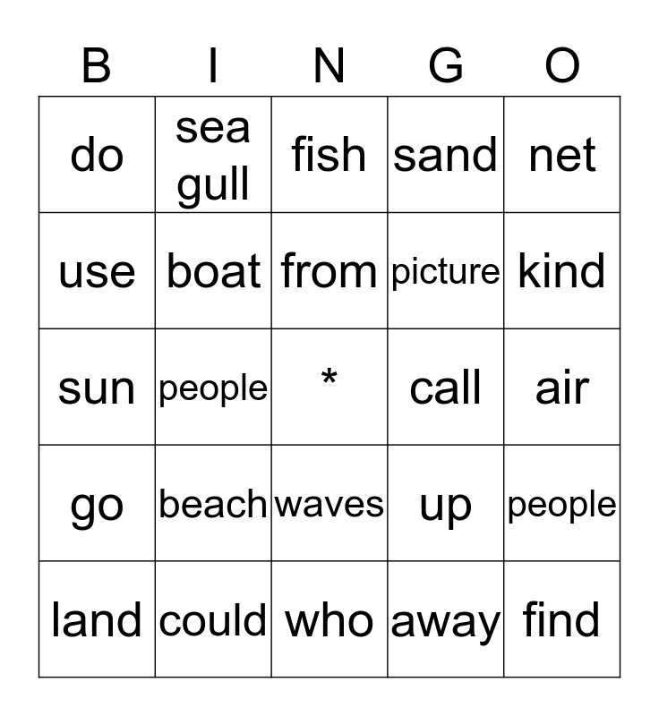 This bingo card has a free space and 24 words: beach, could, from, land, net, do, use, sea gull, call, waves, picture, sun, up, people, boat, away, air, fish, kind, people, find, go, sand and who.