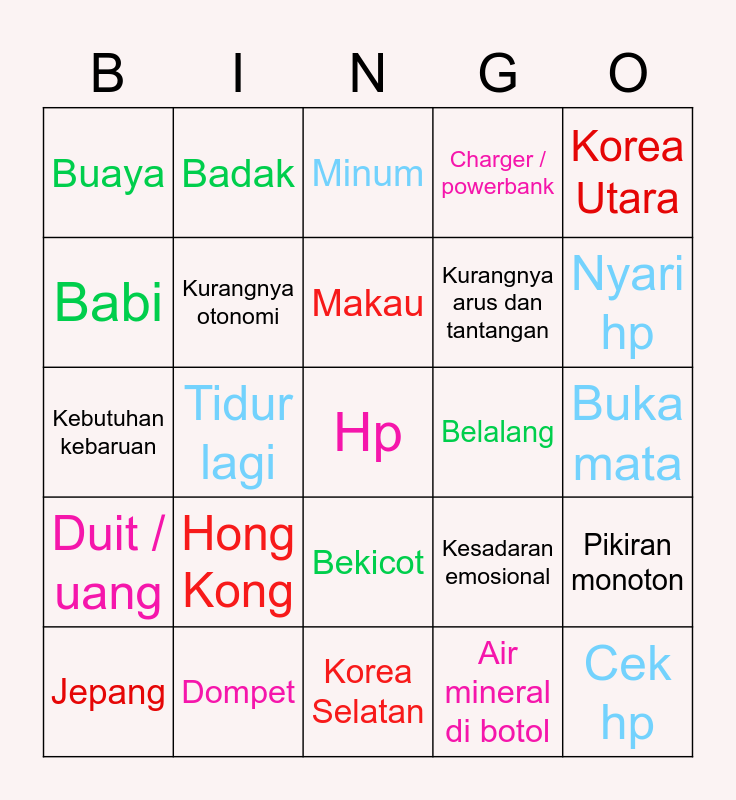 This bingo card has 25 words: Hong Kong, Korea Selatan, Makau, Jepang, Korea Utara, Buaya, Babi, Badak, Belalang, Bekicot, Kurangnya arus dan tantangan, Kebutuhan kebaruan, Kesadaran emosional, Pikiran monoton, Kurangnya otonomi, Cek hp, Buka mata, Minum, Nyari hp, Tidur lagi, Hp, Dompet, Duit / uang, Charger / powerbank and Air mineral di botol.