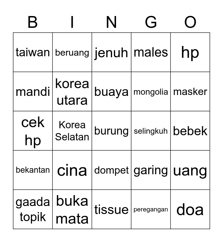 This bingo card has a free space and 24 words: cina, buka mata, buaya, gaada topik, hp, taiwan, mandi, beruang, selingkuh, dompet, mongolia, cek hp, garing, uang, korea utara, peregangan, bebek, jenuh, masker, Korea Selatan, doa, bekantan, males and tissue.
