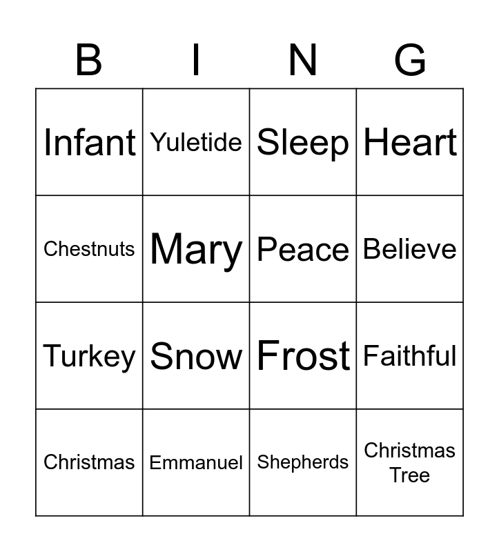 This bingo card has 30 words: Free!, Calm, Faithful, Bright, Infant, Sleep, Peace, Stars, Emmanuel, Angels, Shepherds, Christmas, Bells, Merry, Snow, Mistletoe, Presents, Christmas Tree, Love, Chestnuts, Frost, Carols, Yuletide, Turkey, Mary, Heart, Stocking, Santa Claus, Believe and Celebrate.