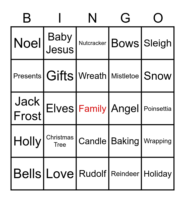 This bingo card has a free space and 49 words: Christmas, Holiday, Santa, Rudolf, Christmas Tree, Nativity, Baby Jesus, Stockings, Presents, Shopping, Gifts, Bows, Wrapping, Baking, Decorations, Carols, Wreath, Angel, Star, Sleigh, Elves, Reindeer, Noel, Mistletoe, North Pole, Snow, Bells, Lights, Candle, Holly, Candy Cane, Eggnog, Manger, Wise Men, Love, Tinsel, Ornaments, Gingerbread Man, Poinsettia, Chimney, Red & Green, Snowman, Jingle, Garland, Jack Frost, Nutcracker, Frosty, Hallmark and Gnomes.