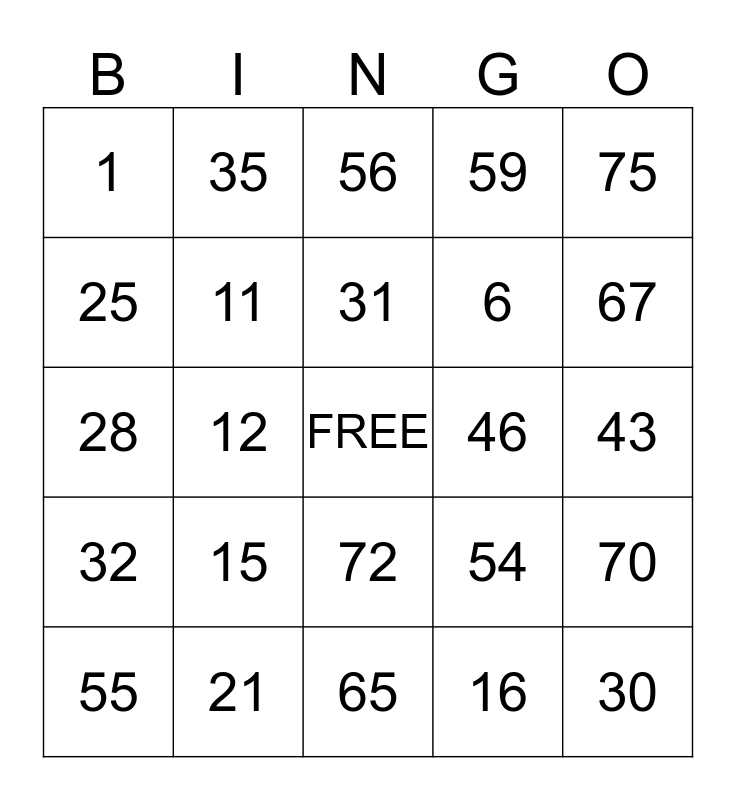 This bingo card has a free space and 24 words: 15, 21, 31, 55, 75, 1, 25, 35, 46, 72, 6, 28, 54, 70, 11, 16, 43, 56, 67, 12, 30, 32, 59 and 65.