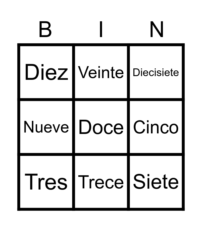 This bingo card has 9 words: Tres, Diecisiete, Veinte, Nueve, Diez, Cinco, Doce, Siete and Trece.