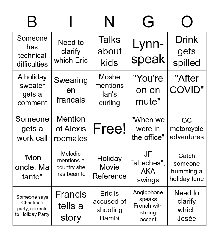This bingo card has a free space and 36 words: A pet appears on screen, A family member enters the room, Someone drinks eggnog, Swearing en francais, JF "streches", AKA swings, "Mon oncle, Ma tante", Moshe mentions Ian's curling, First mention of Fantasy football, Drink gets spilled, Need to clarify which Michel, Mention of Alexis roomates, Lynn-speak, Mention of the DG, "When we were in the office", "After COVID", Someone has technical difficulties, Vaccine talk, Melodie mentions a country she has been to, Need to clarify which Josée, Talks about kids, GC motorcycle adventures, Catch someone humming a holiday tune, Francis tells a story, Someone says Christmas party, corrects to Holiday Party, Eric is accused of shooting Bambi, Need to clarify which Eric, Someone gets a work call, A background is notable enough to elicit a comment, "You're on on mute", A holiday sweater gets a comment, "I'm not ready for Christmas", "IT cousins", Anglophone speaks French with strong accent, Holiday Movie Reference, Patron and Princess.