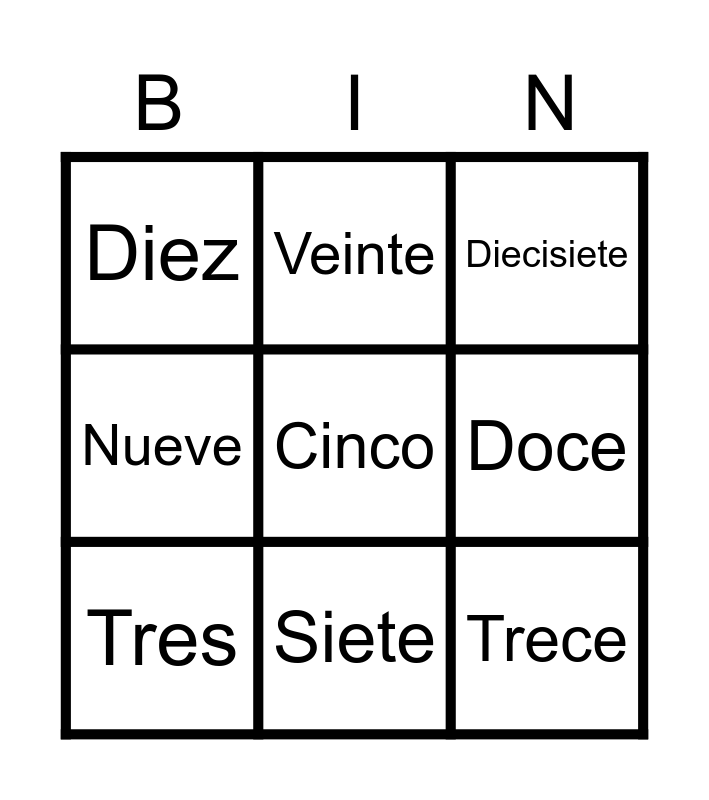 This bingo card has 9 words: Tres, Diecisiete, Veinte, Nueve, Diez, Doce, Cinco, Trece and Siete.