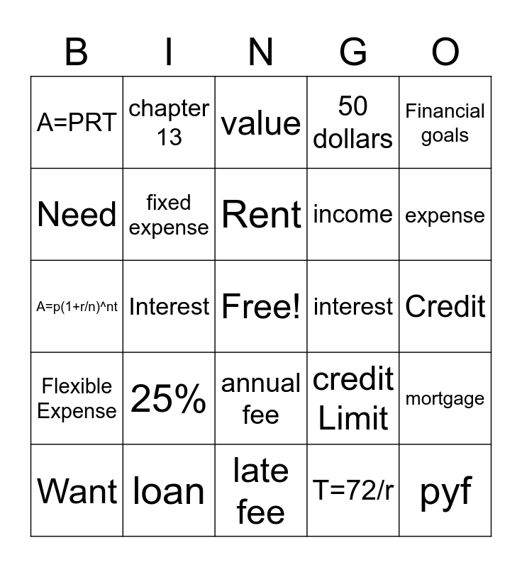 This bingo card has a free space and 29 words: Want, Insurance, Interest, budget, A=PRT, value, fixed expense, 25%, interest, loan, Credit, pyf, late fee, T=72/r, expense, bonds, annual fee, Flexible Expense, Financial goals, A=p(1+r/n)^nt, credit Limit, Stocks, income, Need, 50 dollars, chapter 13, mortgage, Rent and collateral.
