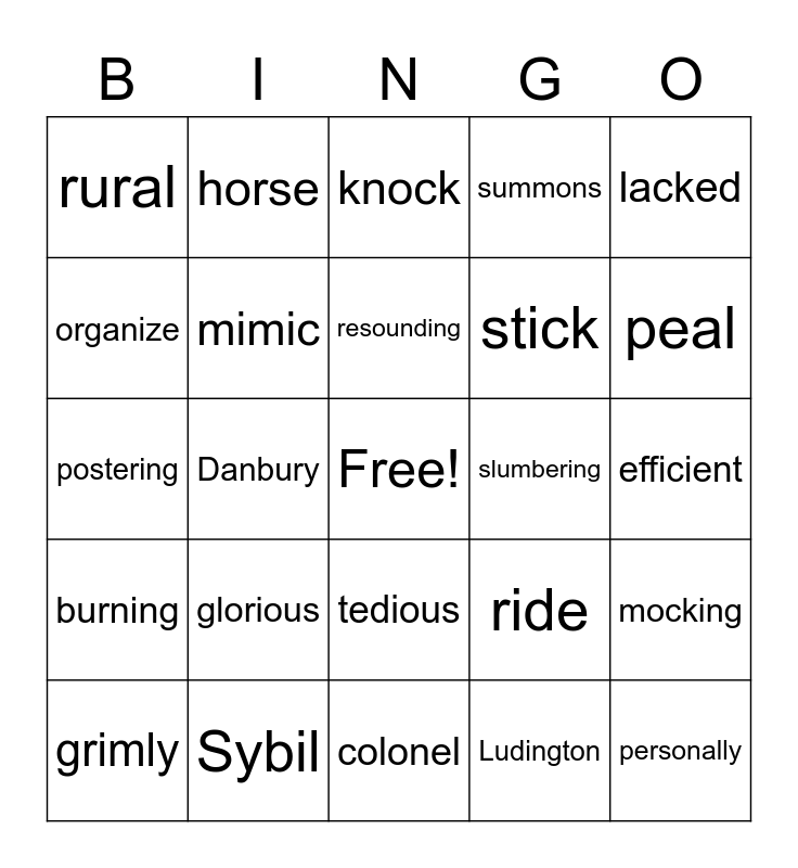 This bingo card has a free space and 24 words: glorious, Sybil, resounding, grimly, lacked, rural, organize, horse, slumbering, tedious, stick, postering, ride, mocking, mimic, Ludington, efficient, knock, peal, Danbury, personally, burning, summons and colonel.