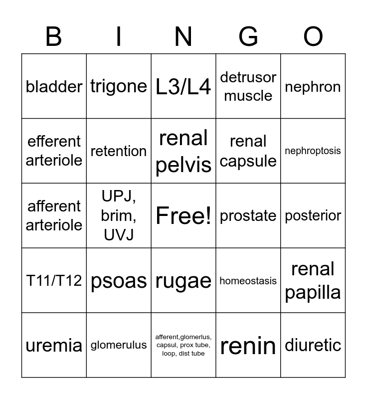 This bingo card has a free space and 34 words: exit, renin, polyuria, hilum, T11/T12, retention, nephron, uremia, trigone, UVJ, renal pelvis, L3/L4, calyces, incontinence, prostate, nephroptosis, glomerulus, afferent arteriole, psoas, homeostasis, rugae, renal pyramids, bladder, posterior, afferent,glomerlus, capsul, prox tube, loop, dist tube, diuretic, detrusor muscle, female, renal capsule, efferent arteriole, retroparitoneal, UPJ, brim, UVJ, renal papilla and filters blood, makes urine.