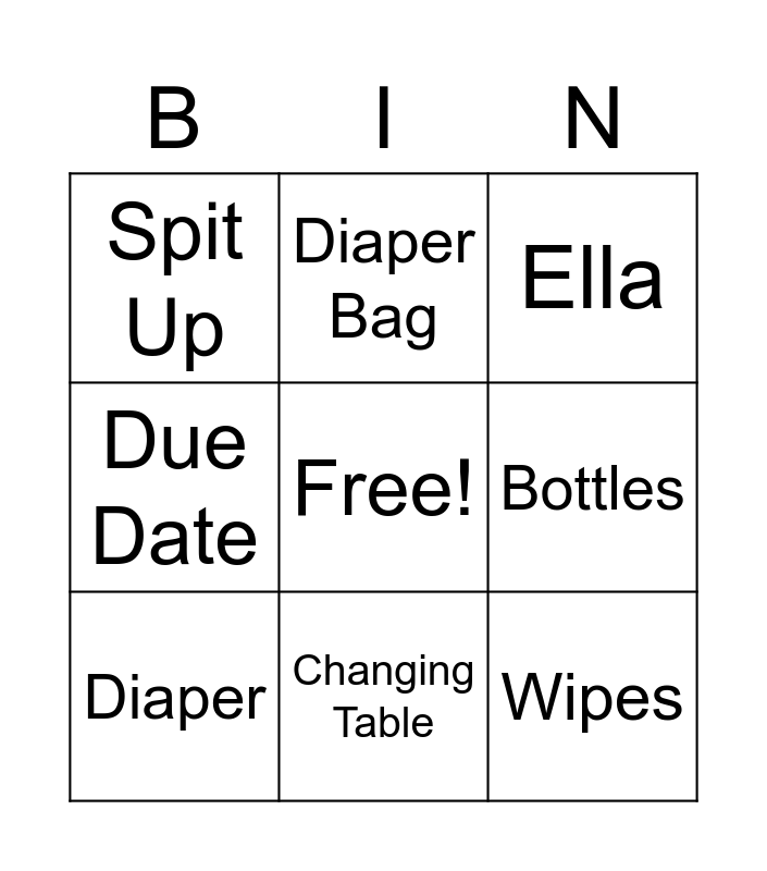 This bingo card has a free space and 9 words: Diaper, Ella, Diaper Bag, Due Date, Spit Up, Bottles, Wipes, Crib and Changing Table.
