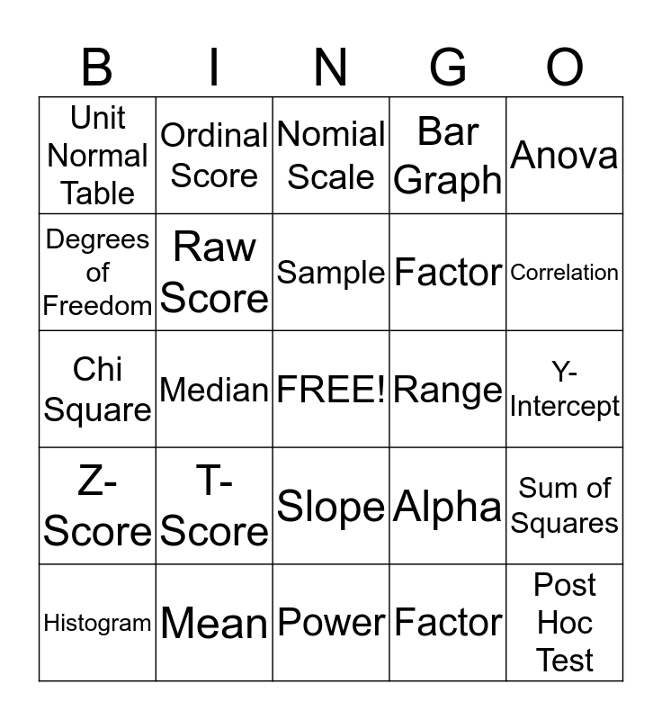 This bingo card has a free space and 24 words: T-Score, Mean, Sample, Histogram, Anova, Unit Normal Table, Degrees of Freedom, Ordinal Score, Range, Slope, Factor, Chi Square, Alpha, Sum of Squares, Raw Score, Factor, Y- Intercept, Nomial Scale, Correlation, Median, Post Hoc Test, Z-Score, Bar Graph and Power.