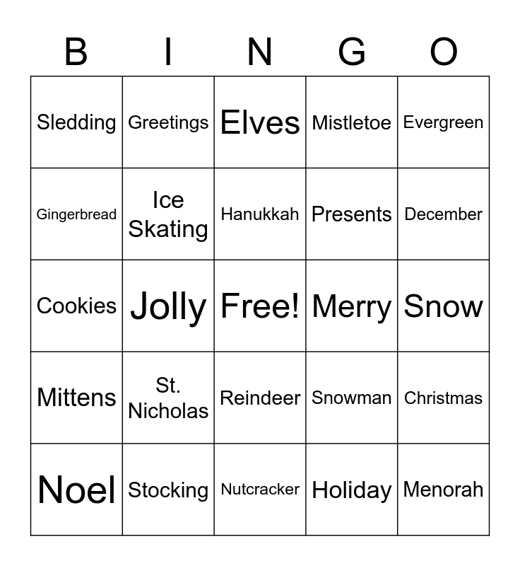 This bingo card has a free space and 24 words: St. Nicholas, Stocking, Hanukkah, Noel, Evergreen, Sledding, Gingerbread, Greetings, Merry, Reindeer, Presents, Cookies, Snowman, Christmas, Ice Skating, Holiday, Snow, Elves, December, Jolly, Menorah, Mittens, Mistletoe and Nutcracker.