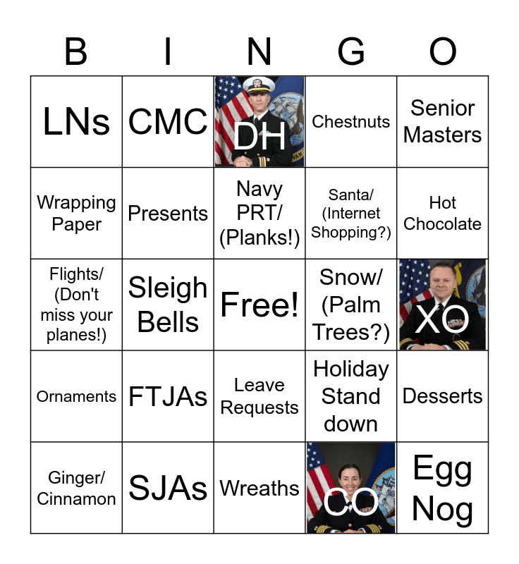 This bingo card has 3 images, a free space and 24 words: FTJAs, SJAs, Navy PRT/ (Planks!), Ginger/ Cinnamon, Senior Masters, LNs, Wrapping Paper, CMC, Snow/ (Palm Trees?), Leave Requests, Santa/ (Internet Shopping?), Flights/ (Don't miss your planes!), Holiday Stand down, Desserts, Presents, CO, XO, DH, Hot Chocolate, Sleigh Bells, Egg Nog, Ornaments, Chestnuts and Wreaths.