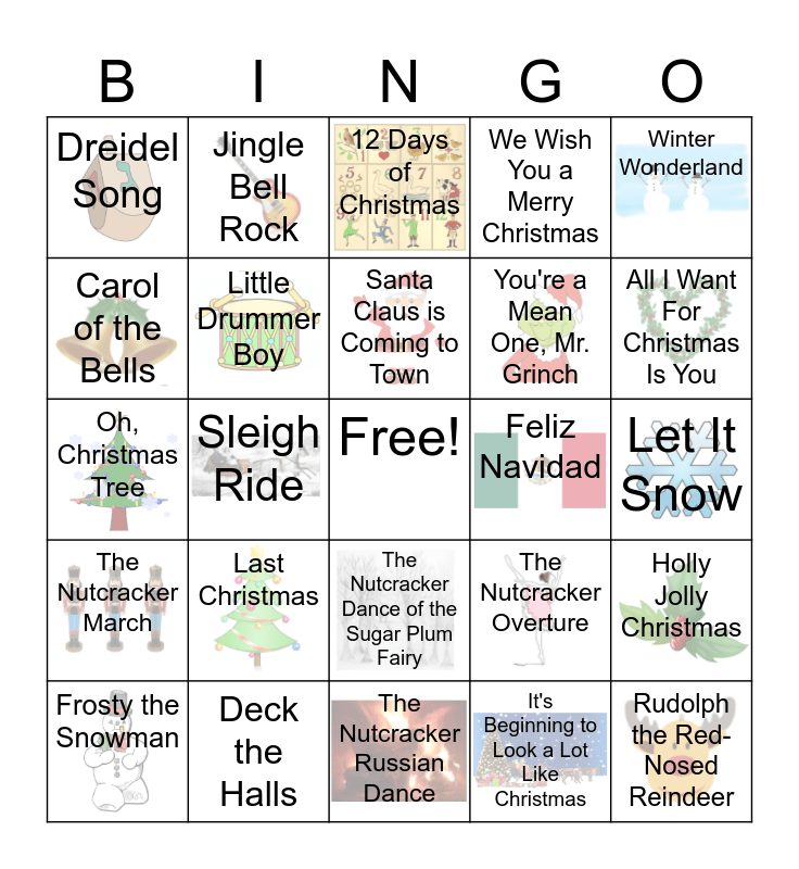 This bingo card has 22 images, a free space and 24 words: Last Christmas, Deck the Halls, Santa Claus is Coming to Town, Frosty the Snowman, Winter Wonderland, Dreidel Song, Carol of the Bells, Jingle Bell Rock, Feliz Navidad, The Nutcracker Dance of the Sugar Plum Fairy, You're a Mean One, Mr. Grinch, Oh, Christmas Tree, The Nutcracker Overture, Holly Jolly Christmas, Little Drummer Boy, It's Beginning to Look a Lot Like Christmas, Let It Snow, 12 Days of Christmas, All I Want For Christmas Is You, Sleigh Ride, Rudolph the Red-Nosed Reindeer, The Nutcracker March, We Wish You a Merry Christmas and The Nutcracker Russian Dance.