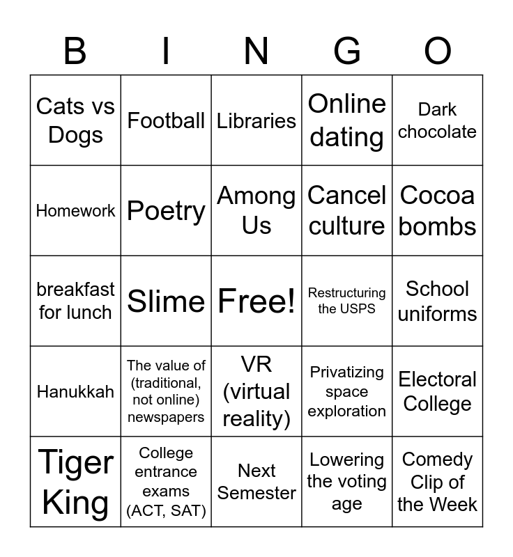 This bingo card has a free space and 24 words: The value of (traditional, not online) newspapers, College entrance exams (ACT, SAT), Among Us, Tiger King, Dark chocolate, Cats vs Dogs, Homework, Football, Restructuring the USPS, VR (virtual reality), Cancel culture, breakfast for lunch, Privatizing space exploration, Electoral College, Poetry, Lowering the voting age, School uniforms, Libraries, Cocoa bombs, Slime, Comedy Clip of the Week, Hanukkah, Online dating and Next Semester.
