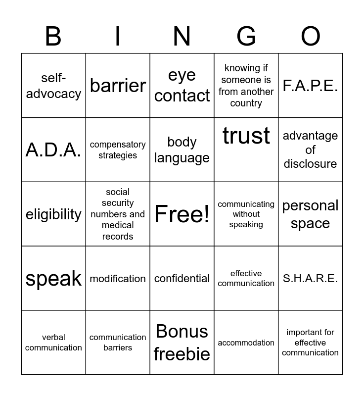 This bingo card has a free space and 24 words: modification, communication barriers, body language, verbal communication, F.A.P.E., self-advocacy, A.D.A., barrier, communicating without speaking, confidential, trust, eligibility, effective communication, S.H.A.R.E., compensatory strategies, accommodation, personal space, eye contact, advantage of disclosure, social security numbers and medical records, important for effective communication, speak, knowing if someone is from another country and Bonus freebie.