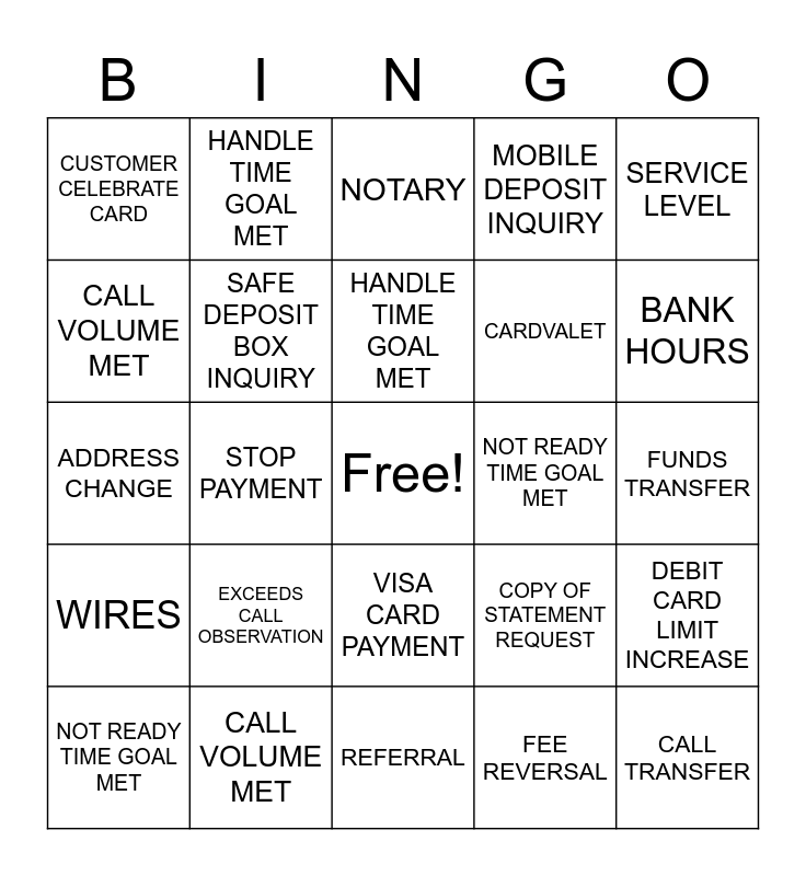 This bingo card has a free space and 24 words: EXCEEDS CALL OBSERVATION, CALL VOLUME MET, HANDLE TIME GOAL MET, NOT READY TIME GOAL MET, SERVICE LEVEL, CUSTOMER CELEBRATE CARD, CALL VOLUME MET, HANDLE TIME GOAL MET, NOT READY TIME GOAL MET, VISA CARD PAYMENT, CARDVALET, ADDRESS CHANGE, COPY OF STATEMENT REQUEST, DEBIT CARD LIMIT INCREASE, SAFE DEPOSIT BOX INQUIRY, FEE REVERSAL, FUNDS TRANSFER, NOTARY, BANK HOURS, STOP PAYMENT, CALL TRANSFER, WIRES, MOBILE DEPOSIT INQUIRY and REFERRAL.