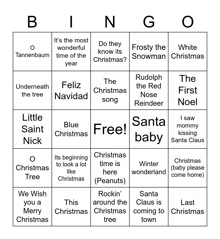 This bingo card has a free space and 52 words: All I want for Christmas is you, Last Christmas, Santa Tell me, Rockin’ around the Christmas tree, Its beginning to look a lot like Christmas, Jingle Bell Rock, It’s the most wonderful time of the year, Let it snow, let is snow, let it snow, Underneath the tree, Sleigh Ride, Feliz Navidad, A holly jolly Christmas, Christmas (baby please come home), Winter wonderland, Carol of the bells, Have yourself a merry little Christmas, The Christmas song, Santa baby, Silver bells, White Christmas, Blue Christmas, Santa Claus is coming to town, O Tannenbaum, Rudolph the Red Nose Reindeer, Do you hear what I hear?, You’re a mean one Mr. Grinch, Here comes Santa Claus, Joy to the world, The First Noel, Run Rudolph Run, Little Drummer Boy, Frosty the Snowman, Baby, its cold outside, Ill be home for Christmas, Happy Xmas (war is over), Do they know its Christmas?, This Christmas, Silent Night, The man with the bag, Caroling, Caroling, Caroling, All I want for Christmas is my two front teeth, I saw mommy kissing Santa Claus, O Christmas Tree, Christmas Time, Christmas time is here (Peanuts), God rest ye merry gentlemen, Wonderful Christmas time, Little Saint Nick, Twelve Days of Christmas, O Little town of Bethlehem, We Wish you a Merry Christmas and Hark! The Herald Angels Sing.