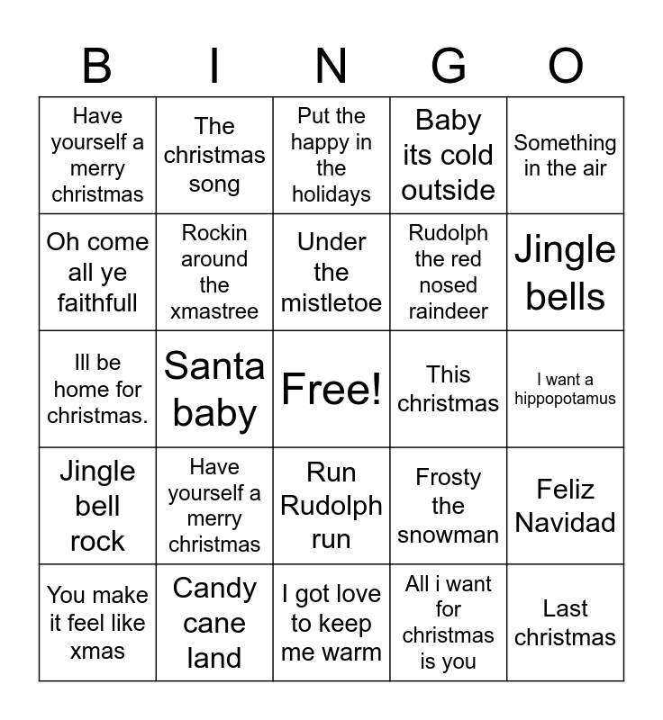 This bingo card has a free space and 34 words: Santa clause is coming to town, All i want for christmas is you, Winter wonderland, Ring in the season, Jingle bell rock, Rockin around the xmastree, Something in the air, You make it feel like xmas, The christmas song, I need you christmas, Under the mistletoe, Put the happy in the holidays, Christmas wrapping, Santa tell me, This christmas, Jingle bells, Candy cane land, Ill be home for christmas., Have yourself a merry christmas, Frosty the snowman, Run Rudolph run, My only wish this year, Have yourself a merry christmas, I want a hippopotamus, I got love to keep me warm, Last christmas, Baby its cold outside, Let it snow, Rudolph the red nosed raindeer, Oh come all ye faithfull, Drummer boy, Santa baby, Feliz Navidad and Little drummer boy.