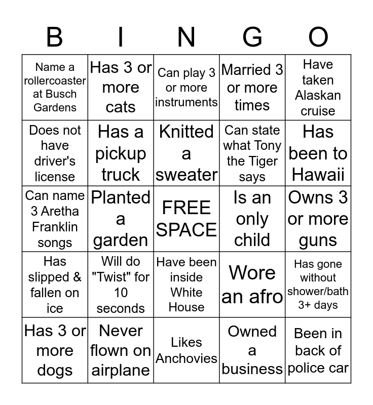 This bingo card has a free space and 24 words: Will do "Twist" for 10 seconds, Never flown on airplane, Knitted a sweater, Has 3 or more dogs, Have taken Alaskan cruise, Name a rollercoaster at Busch Gardens, Does not have driver's license, Has 3 or more cats, Is an only child, Have been inside White House, Can state what Tony the Tiger says, Can name 3 Aretha Franklin songs, Wore an afro, Has gone without shower/bath 3+ days, Has a pickup truck, Owned a business, Owns 3 or more guns, Can play 3 or more instruments, Has been to Hawaii, Planted a garden, Been in back of police car, Has slipped & fallen on ice, Married 3 or more times and Likes Anchovies.