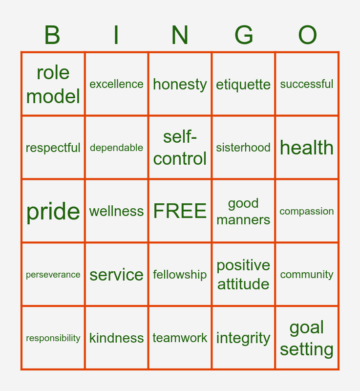 This bingo card has a free space and 24 words: service, kindness, self-control, responsibility, successful, role model, respectful, excellence, good manners, fellowship, sisterhood, pride, positive attitude, community, dependable, integrity, compassion, honesty, health, wellness, goal setting, perseverance, etiquette and teamwork.