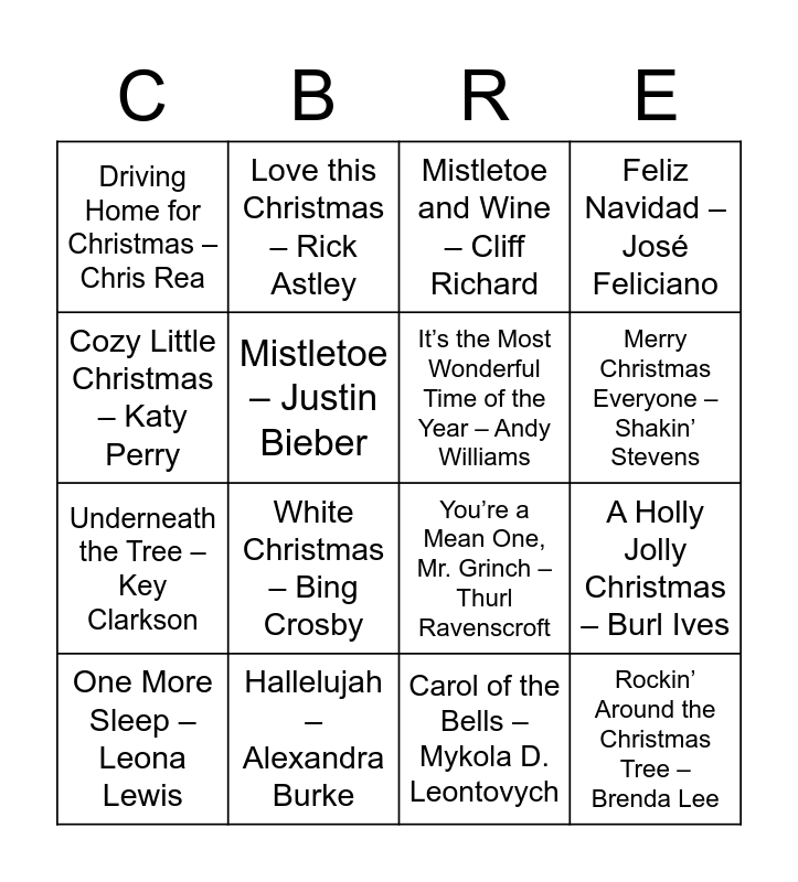 This bingo card has 59 words: All I Want for Christmas Is You – Mariah Carey, Last Christmas – Wham, Santa Tell Me – Ariana Grande, Rockin’ Around the Christmas Tree – Brenda Lee, It’s Beginning to Look a Lot Like Christmas – Bing Crosby, Jingle Bell Rock – Bobby Helms, It’s the Most Wonderful Time of the Year – Andy Williams, Let it Snow – Dean Martin, Underneath the Tree – Key Clarkson, Sleigh Ride – The Ronettes, Feliz Navidad – José Feliciano, Holly Jolly Christmas – Michael Bublé, Mistletoe – Justin Bieber, Wonderful Christmastime – Paul McCartney, Do They Know It’s Christmas? – Band Aid, Driving Home for Christmas – Chris Rea, One More Sleep – Leona Lewis, Cozy Little Christmas – Katy Perry, Stay Another Day – East 17, Merry Christmas Everyone – Shakin’ Stevens, Hallelujah – Alexandra Burke, Mistletoe and Wine – Cliff Richard, Mary’s Boy Child – Boney M., Merry Christmas Everybody – Slade, Happy Xmas (War is Over) – John Lennon, Fairytale of New York – The Pogues, What Christmas Means to Me – Hanson, Santa Claus is Coming to Town – The Jackson 5, White Christmas – Bing Crosby, Candy Cane Lane – Sia, Santa’s Coming For Us – Sia, Incredible Christmas – Gary Barlow, 2000 Miles – Pretenders, Blue Christmas – Elvis Presley, Love this Christmas – Rick Astley, Rudolph the Red-Nosed Reindeer – Burl Ives, Have Yourself a Merry Little Christmas – Frank Sinatra, A Holly Jolly Christmas – Burl Ives, Dominick The Donkey – Lou Monte, You’re a Mean One, Mr. Grinch – Thurl Ravenscroft, Frosty The Snowman – Jimmy Durante, Here Comes Santa Claus – Gene Autry, Carol of the Bells – Mykola D. Leontovych, Santa Baby – Eartha Kitt, The Little Drummer Boy – Harry S. Chorale, Do you Hear What I Hear? – Bing Crosby, Santa Clause is Comin’ to Town – Frank Sinatra, Hark! The Herald Angels Sing – Choir, Silent Night, Holy Night – Choir, Ding Dong! Merrily On High – Choir, Please Come Home For Christmas – Jon Bon Jovi, When You Wish Upon A Star – The Mamas, Baby, It’s Cold Outside – Steve Lawrence/Eydie Gorme, Man With The Bag – Stephanie’s Child, I Saw Mommy Santa Claus – Jackson 5, One Wish – Whitney Houston, Twelve Days of Christmas – John Denver/The Muppets, We Three Kings – George Strait and Silver Bells – Bing Crosby/Carol Richard.