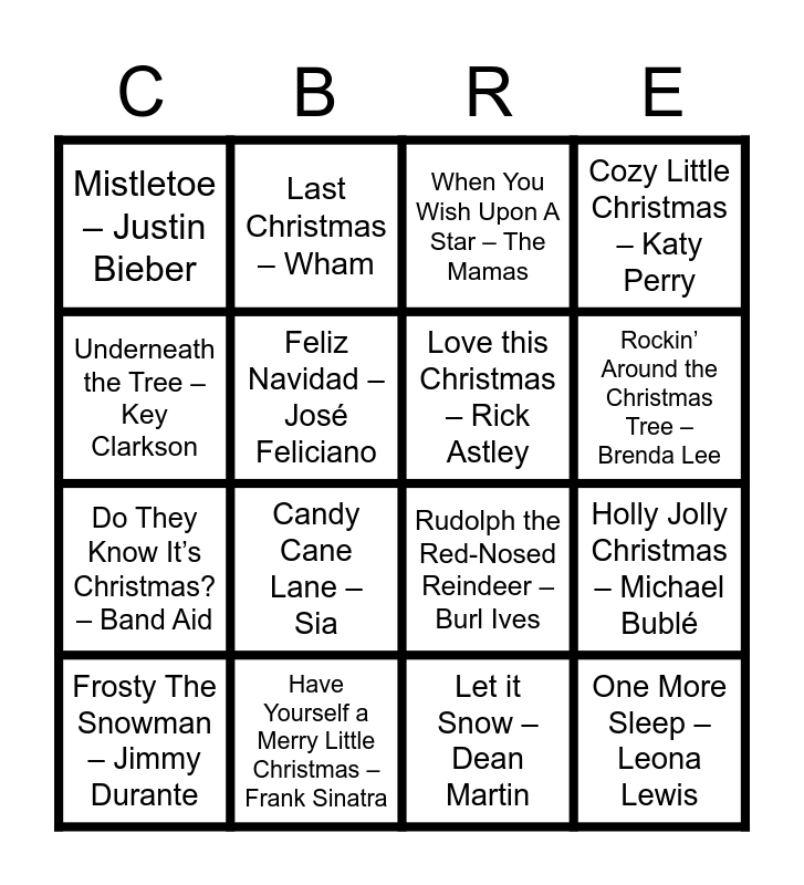 This bingo card has 5 images and 59 words: All I Want for Christmas Is You – Mariah Carey, Last Christmas – Wham, Santa Tell Me – Ariana Grande, Rockin’ Around the Christmas Tree – Brenda Lee, It’s Beginning to Look a Lot Like Christmas – Bing Crosby, Jingle Bell Rock – Bobby Helms, It’s the Most Wonderful Time of the Year – Andy Williams, Let it Snow – Dean Martin, Underneath the Tree – Key Clarkson, Sleigh Ride – The Ronettes, Feliz Navidad – José Feliciano, Holly Jolly Christmas – Michael Bublé, Mistletoe – Justin Bieber, Wonderful Christmastime – Paul McCartney, Do They Know It’s Christmas? – Band Aid, Driving Home for Christmas – Chris Rea, One More Sleep – Leona Lewis, Cozy Little Christmas – Katy Perry, Stay Another Day – East 17, Merry Christmas Everyone – Shakin’ Stevens, Hallelujah – Alexandra Burke, Mistletoe and Wine – Cliff Richard, Mary’s Boy Child – Boney M., Merry Christmas Everybody – Slade, Happy Xmas (War is Over) – John Lennon, Fairytale of New York – The Pogues, What Christmas Means to Me – Hanson, Santa Claus is Coming to Town – The Jackson 5, White Christmas – Bing Crosby, Candy Cane Lane – Sia, Santa’s Coming For Us – Sia, Incredible Christmas – Gary Barlow, 2000 Miles – Pretenders, Blue Christmas – Elvis Presley, Love this Christmas – Rick Astley, Rudolph the Red-Nosed Reindeer – Burl Ives, Have Yourself a Merry Little Christmas – Frank Sinatra, A Holly Jolly Christmas – Burl Ives, Dominick The Donkey – Lou Monte, You’re a Mean One, Mr. Grinch – Thurl Ravenscroft, Frosty The Snowman – Jimmy Durante, Here Comes Santa Claus – Gene Autry, Carol of the Bells – Mykola D. Leontovych, Santa Baby – Eartha Kitt, The Little Drummer Boy – Harry S. Chorale, Do you Hear What I Hear? – Bing Crosby, Santa Clause is Comin’ to Town – Frank Sinatra, Hark! The Herald Angels Sing – Choir, Silent Night, Holy Night – Choir, Ding Dong! Merrily On High – Choir, Please Come Home For Christmas – Jon Bon Jovi, When You Wish Upon A Star – The Mamas, Baby, It’s Cold Outside – Steve Lawrence/Eydie Gorme, Man With The Bag – Stephanie’s Child, I Saw Mommy Santa Claus – Jackson 5, One Wish – Whitney Houston, Twelve Days of Christmas – John Denver/The Muppets, We Three Kings – George Strait and Silver Bells – Bing Crosby/Carol Richard.