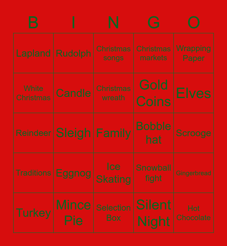This bingo card has a free space and 74 words: Star, Christmas stocking, Christmas songs, Joy, Baubles, Snowman, Father Christmas, Fairy lights, Turkey, Candy canes, Gifts, Christmas tree, Christmas wreath, White Christmas, Angel, Sleigh, Mulled Wine, Elves, Sprouts, Reindeer, Candle, Rudolph, Christmas markets, Merry, Hot Chocolate, Tinsel, Holly, Three Kings, Mistletoe, Frost, Wrapping Paper, Pigs in Blankets, Christmas Pudding, Queens Speech, Christingle, Silent Night, Nativity, Chestnuts, Sparkle, Advent, Selection Box, Mince Pie, Crackers, Glitter, Starry Night, Lapland, Jingle Bells, Eggnog, Chimney, Coal, Christmas Sack, Christmas Jumpers, Scrooge, The Grinch, Stollen, Merry, Ice Skating, North Pole, Bright, Gingerbread, Gold Coins, Bucks fizz, Traditions, Icicles, Bobble hat, Mittens, Music, Mariah, Snowball fight, Paper hats, Earmuffs, Garland, Christmas Pjs and Cinnamon.