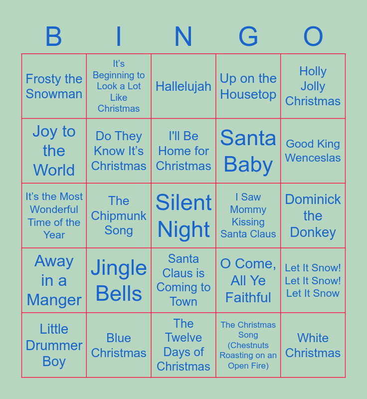 This bingo card has 56 words: Free!, Little Drummer Boy, Do You Hear What I Hear, Frosty the Snowman, The Twelve Days of Christmas, I Heard the Bells on Christmas Day, Do They Know It’s Christmas, Hark! the Herald Angels Sing, Santa Baby, I Want A Hippopotamus For Christmas, Up on the Housetop, Rudolph the Red-Nosed Reindeer, Rockin' Around the Christmas Tree, I Saw Three Ships, Silver Bells, What Child Is This, Holly Jolly Christmas, The Chipmunk Song, Baby, It’s Cold Outside, Silent Night, I Saw Mommy Kissing Santa Claus, All I Want For Christmas Is My Two Front Teeth, O Come, All Ye Faithful, Hallelujah, O Tannenbaum, I'll Be Home for Christmas, The Red Baron Song, You’re a Mean One, Mr. Grinch, Good King Wenceslas, O Holy Night, Have Yourself a Merry Little Christmas, Underneath the Tree, Jingle Bell Rock, All I Want for Christmas Is You, Dominick the Donkey, Joy to the World, It’s the Most Wonderful Time of the Year, Deck the Halls, Away in a Manger, It’s Beginning to Look a Lot Like Christmas, Santa Claus is Coming to Town, White Christmas, Feliz Navidad, Walking in a Winter Wonderland, Happy Holidays, Jingle Bells, Blue Christmas, Mele Kalikimaka, Sleigh Ride., God Rest Ye Merry Gentlemen, The Christmas Song (Chestnuts Roasting on an Open Fire), The First Noel, Mary’s Boy Child, This Christmas, Let It Snow! Let It Snow! Let It Snow and Grandma Got Run Over by a Reindeer.